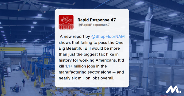 - The White House’s rapid response account on X (formerly Twitter) promoted the NAM’s latest ad, quoting key language from the ad.
