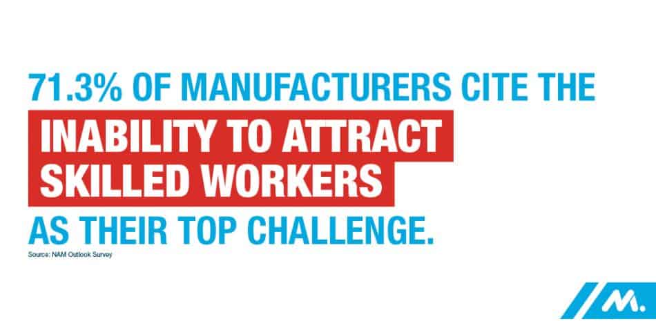 Empowered by tax reform and regulatory certainty, manufacturers are investing in our communities and in our people. Our latest Manufacturers’ Outlook Survey shows nine consecutive quarters of record optimism, with an average of 91.8 percent of manufacturers positive about their own company’s outlook over that time frame, compared to an average of 68.6 percent across the two years of 2015 and 2016. Manufacturers’ top concern remains the inability to attract and retain a quality workforce, and concerns about our nation’s crumbling infrastructure continue to rise.